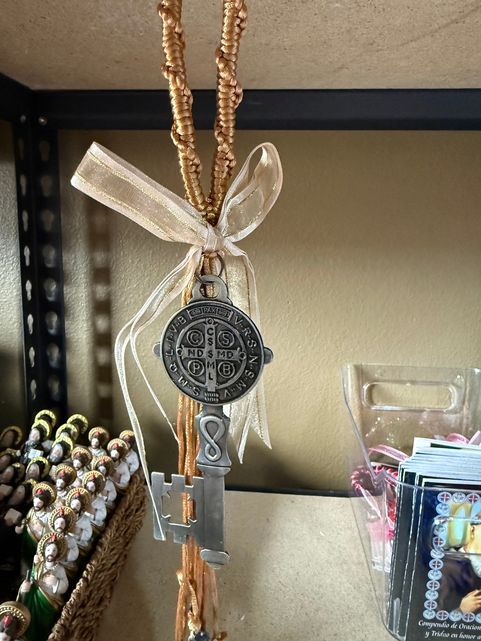 This powerful hanging amulet features the sacred medal of San Benito (Saint Benedict) paired with a symbolic key, representing protection, authority, and the power to open and close spiritual doors. Handcrafted with a braided cord and finished with a soft gold ribbon, this piece carries both elegance and deep spiritual meaning—perfect for those seeking strong energetic protection and divine guidance