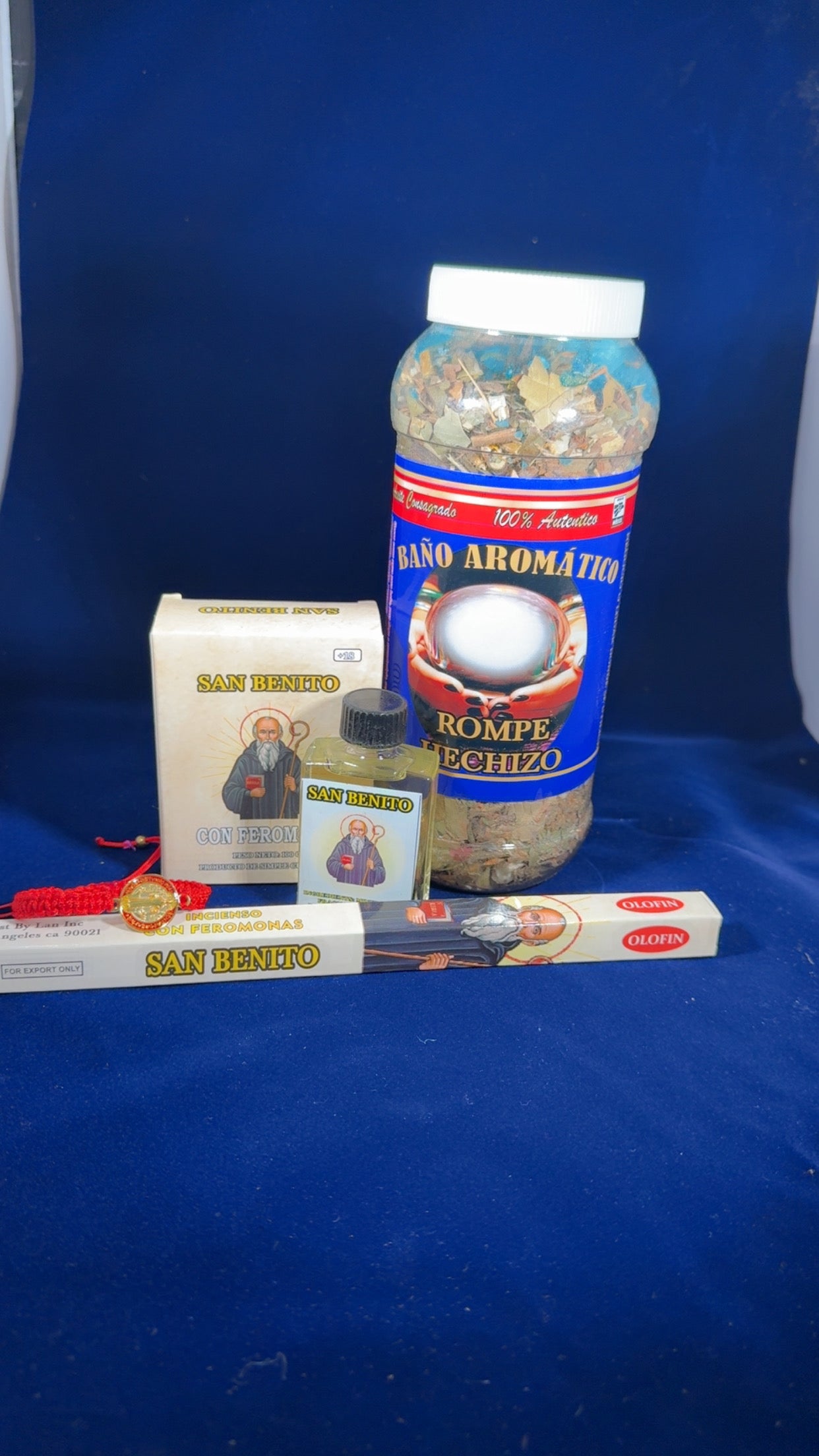 Remove any brujeria that you may have with this kit. It comes with the Rompe Hechizo Cleanse, San Benito oil, soap, incense and protection bracelet.