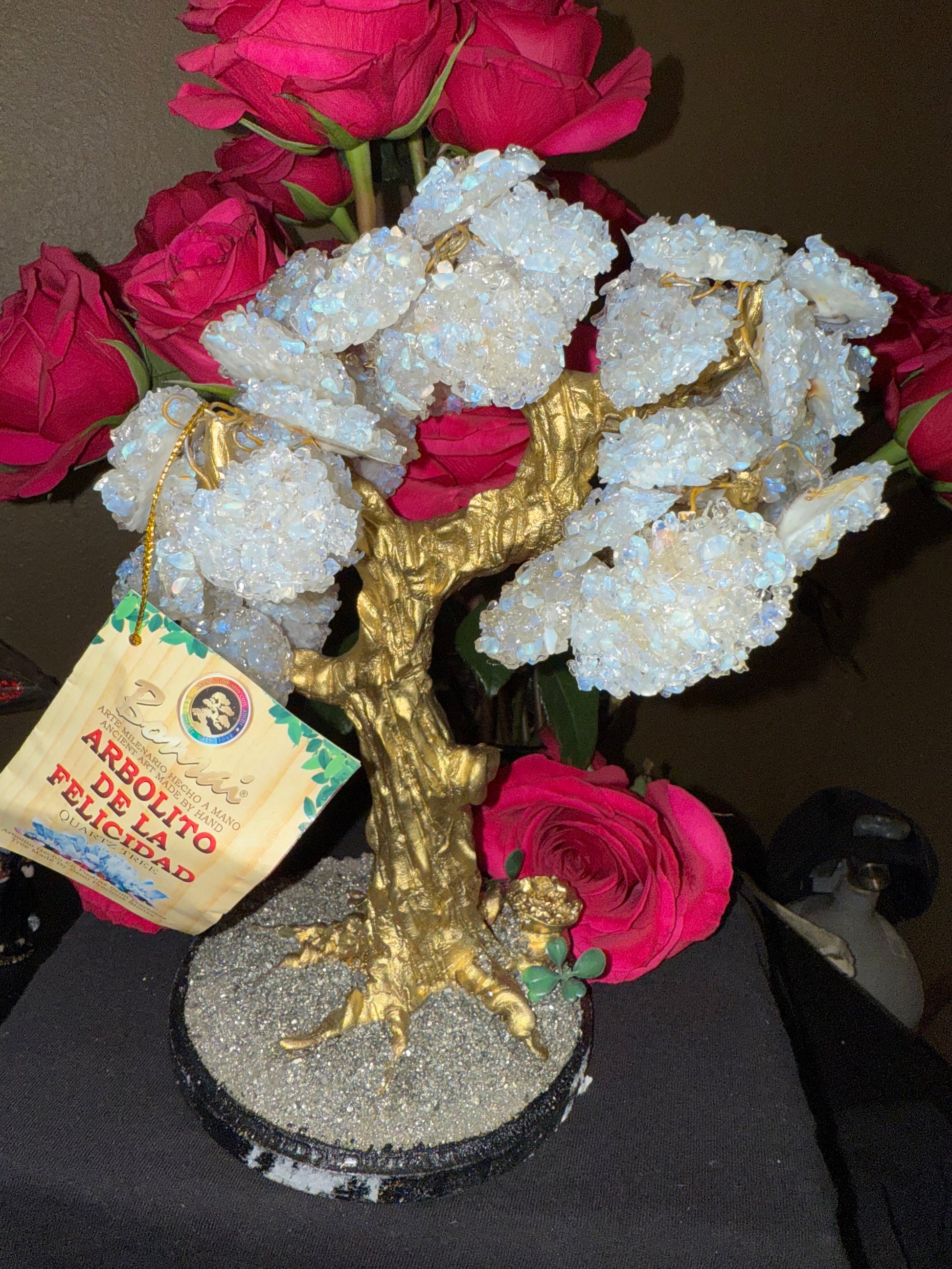 Quartz is known as the “master healer” crystal — it amplifies energy, brings clarity, and aligns with all chakras. A Tree of Happiness symbolizes joy, harmony, peace, and positive energy in the home.The golden trunk adds the energy of abundance, prosperity, and divine connection.Since quartz amplifies intentions, this tree can be programmed for love, happiness, health, or protection, depending on what you focus on.