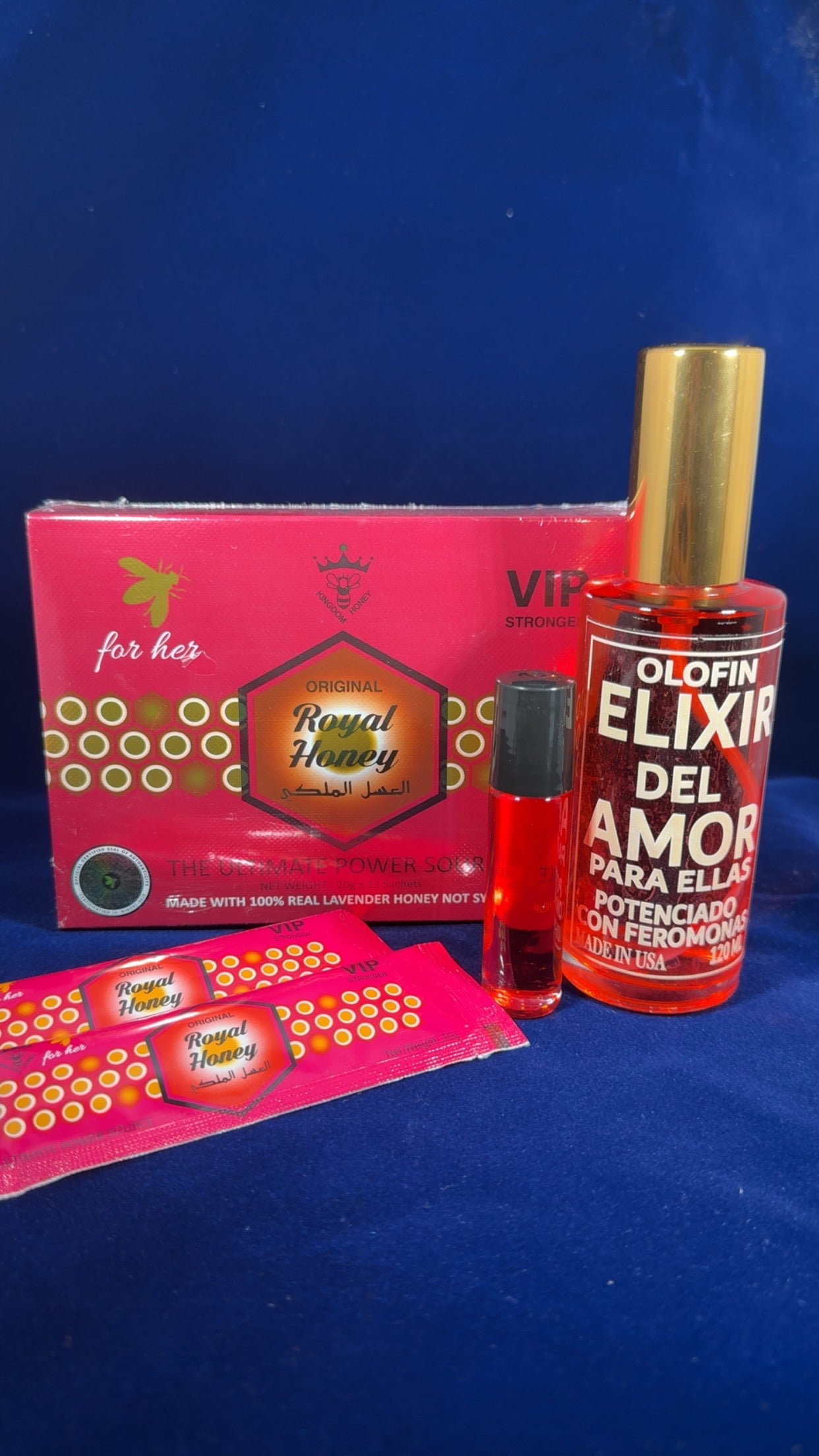 Nothing like the mood setter for the night! The Royal Honey for her is intended to arisen your sexual libido, energy and mood. The bundle includes or Elixir for her perfume and Prendeme Mini fermonas roll on so you can tap into her dark feminine, sexual energy
