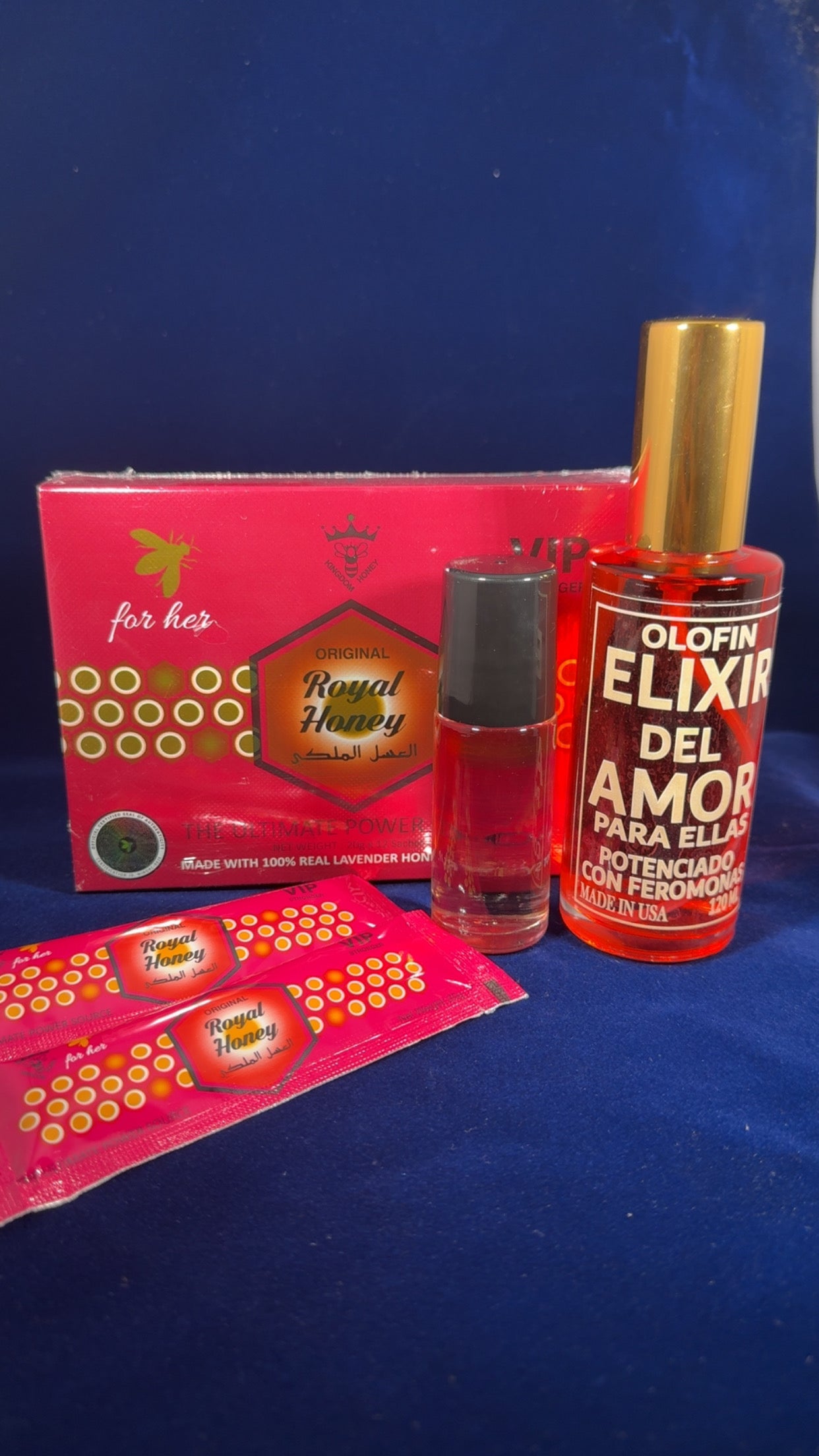 Nothing like the mood setter for the night! The Royal Honey for her is intended to arisen your sexual libido, energy and mood. The bundle includes or Elixir for her perfume and Prendeme fermonas roll on so you can tap into her dark feminine, sexual energy